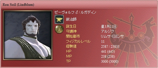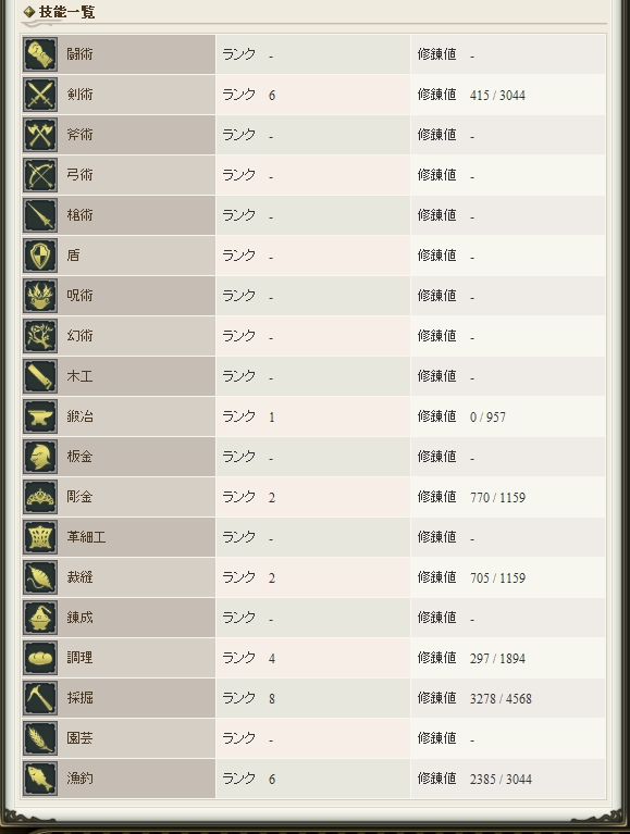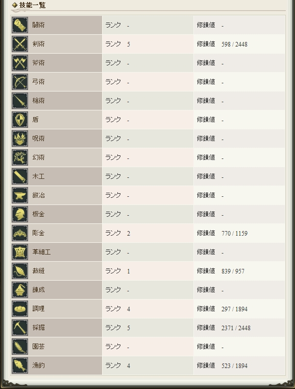 剣術5・漁師4・採掘2・料理2・フィジカル9