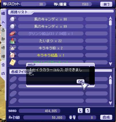 まずはカラーコルスの耐久度26↑を目指してMR・・・これがお金かかるんです・・・前回は2回目(180万seed)で成功。そして今回は・・・3回目(270万seed)で成功しました・・・